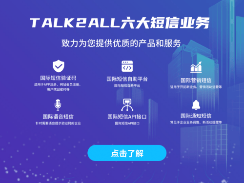 Talk2all是一家专业的国际网络通信公司,现已取得增值电信业务牌照、码号资源使用权等,各种资质齐备。我们的业务场景主要为:跨境旅游、跨境海运、跨境商务与跨境电商4大类。平台营业多年,口碑好,安全、稳定,为客户提供方便、快捷的群发短信服务,支持免费测试,长期提供免费升级和维护,售后客服全天24小时在线,为各类用户提供更实惠、更优质的服务。