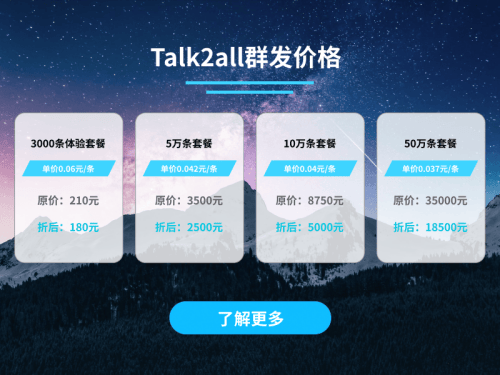 Talk2all国际短信平台通道稳定、到达率高,下发速度快,售后服务完善,还能免费提供短信测试,欢迎各大企业用户前来咨询。