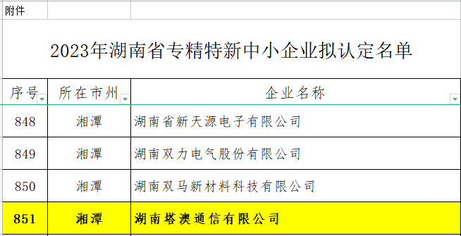 根据工业和信息化部《优质中小企业梯度培育管理暂行办法》(工信部企业〔2022〕63号)和《湖南省工业和信息化厅关于组织开展2023年湖南省专精特新中小企业申报和复核工作的通知》要求,经我司申报,市州和县市区中小企业主管部门审核推荐、专家评审,湖南塔澳通信有限公司榜上有名。