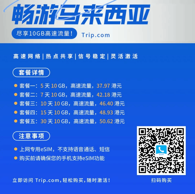 无论你是前往马来西亚还是柬埔寨,Talk2all eSIM卡都能快速接入当地运营商网络,提供高效、稳定的网络连接,畅享高速数据服务。通过Trip.com购买,激活简单,使用灵活,是现代旅行者的理想选择。