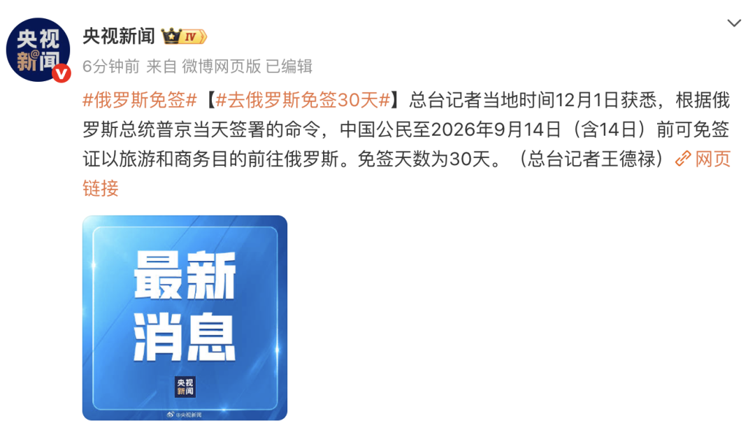 据央视新闻记者当地时间12月1日获悉,根据俄罗斯总统普京签署的命令,自2025年12月1日起至2026年9月14日(含9月14日)止,中国公民可免签证以旅游和商务目的前往俄罗斯。免签天数为30天。