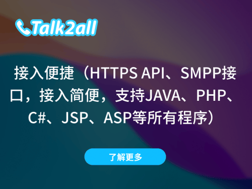 Talk2all国际短信服务平台覆盖全球230个国家和地区,强大的产品应用及功能,三网合一,短信5s送达、送达率99%,安全、稳定,售后客服24小时在线,为您解决后顾之忧。