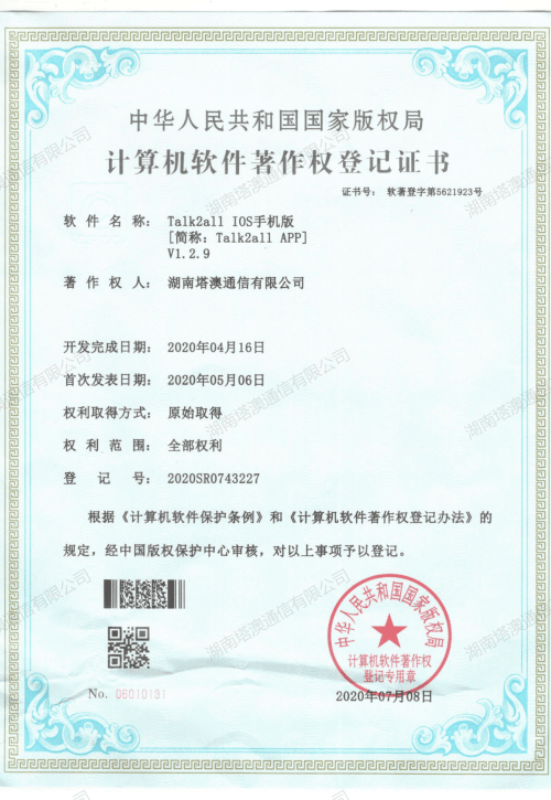 Talk2all App(IOS版)软件著作权证书