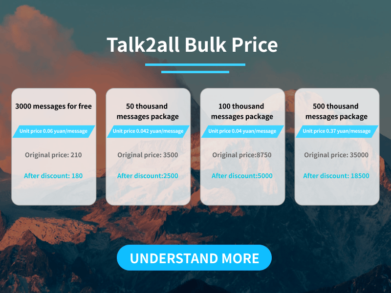 3. How much do you charge for sending SMS to foreign countries? There is no unified standard for the charges for sending SMS to foreign countries. There will not be too much difference in price and it will not be too expensive. The platform usually recommends that users buy packages more cost-effective. An international SMS is between 0.2 yuan and 0.8 yuan. International platforms generally adopt the method of pre charging, and deduct fees according to the amount of short messages sent by users. After a period of time, users will receive the current consumption records sent by the platform. For regular short message platforms, such as talk2all international short message platform, users do not need to worry about whether there is arbitrary deduction of fees.
